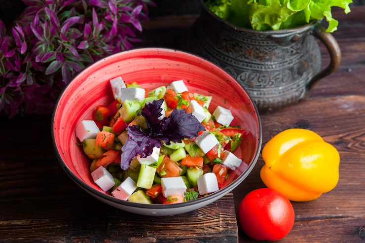 Адыгейский салат с баклажанами приготовлен и готов к подаче в качестве закуски.