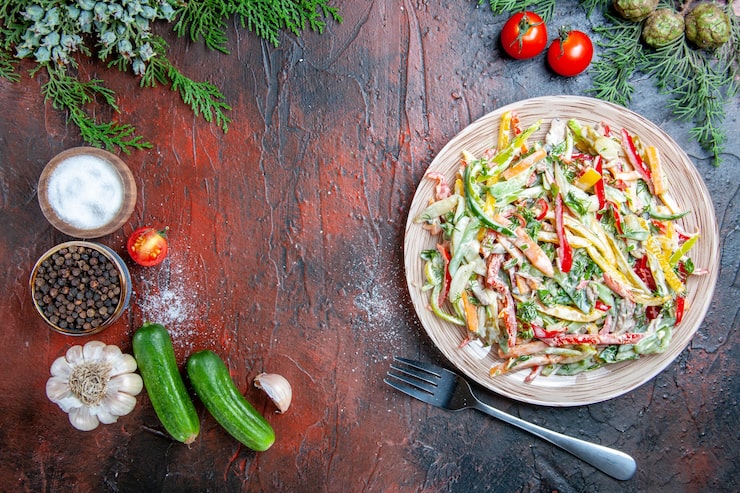 Соедините все овощи, заправьте соусом. Добавьте соль и перец по вкусу.