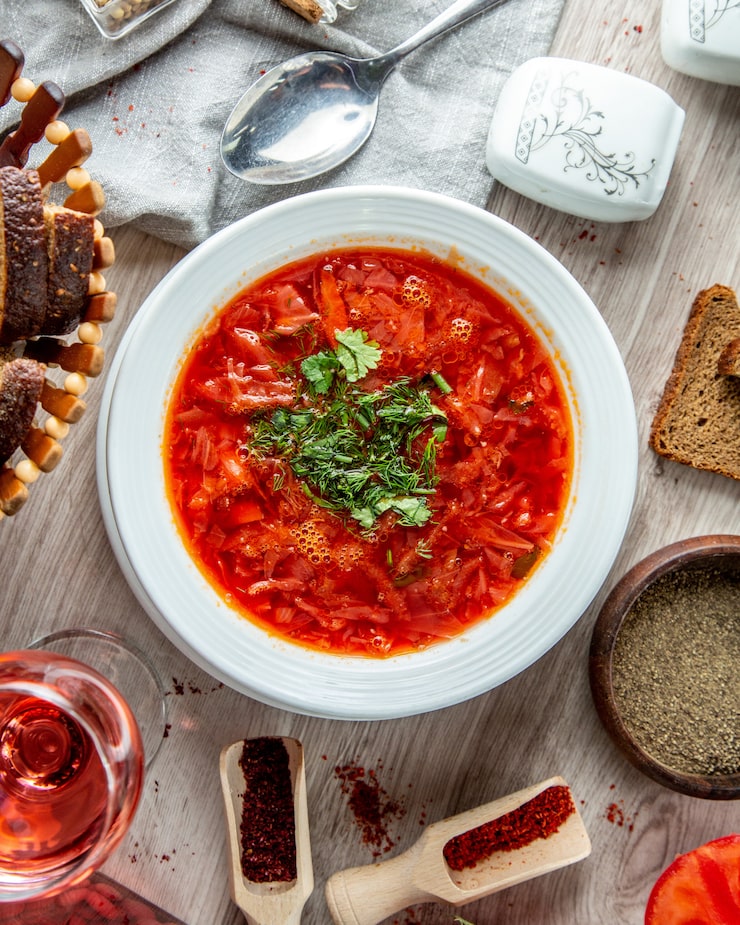 Яркий борщ с помидорами рекомендуется подавать со сметаной или майонезом любой жирности, а также с пампушками и другой несладкой выпечкой. Стоит учитывать, что на следующий день первое блюдо становится еще более вкусным, а его аромат – более насыщенным. Для придания дополнительного вкуса перед выключением нагрева в кастрюлю можно добавить раздавленный зубчик чеснока.