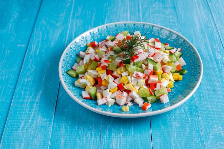 Кальмары, крабовые палочки и кукуруза в освежающем салате