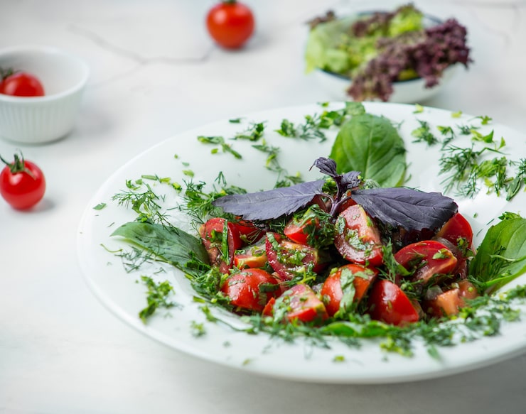 Помидоры, лук-порей и шпинат в освежающем салате