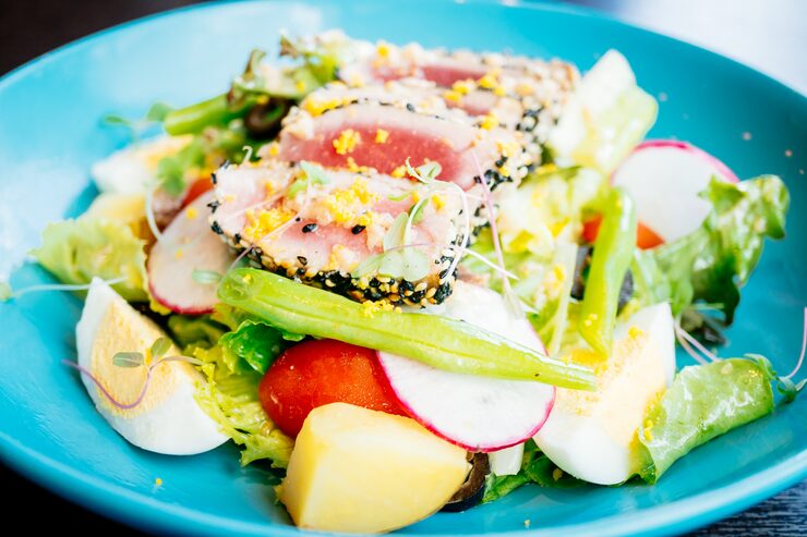 Чтобы завершить приготовление, достаточно снять сервировочное кольцо и декорировать салат по желанию. Салат из крабовых палочек и ананаса готов к подаче! Наслаждайтесь!