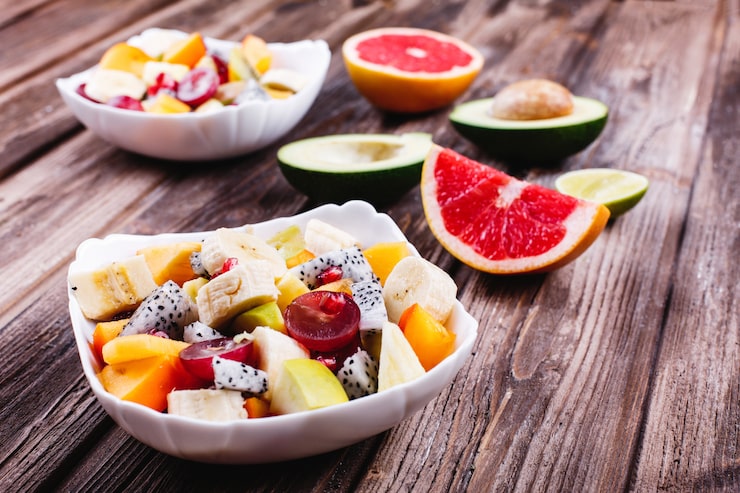 Отделите виноград от веточек, разрежьте каждую ягоду пополам и удалите косточки. Добавьте виноград к остальным фруктам. Переложите салат в сервировочную тарелку и подавайте к столу незамедлительно.