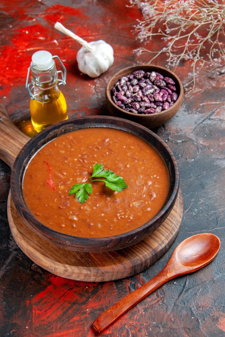 Для получения более насыщенного и выразительного вкуса, основу для супа обжарим на копченом беконе, что придаст блюду приятные ароматические оттенки. Фасоль можно использовать консервированную или предварительно отварить обычную белую фасоль. Кроме того, суп можно приготовить на любом бульоне.