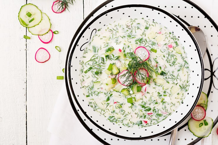 Приготовление супа занимает всего 5 минут. Используйте охлажденный кефир, измельчите овощи и соедините их. Подавать блюдо к столу готово!