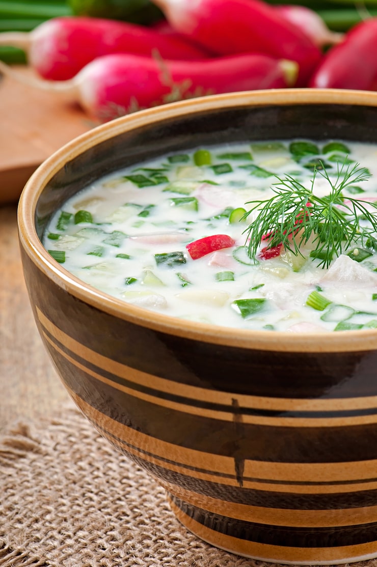 Окрошку нередко делают с колбасой, однако традиционный рецепт предполагает использование отварного мяса. В качестве основы могут выступать говядина, свинина, курица или индейка. Такая окрошка должна быть приготовлена на кислом квасе. В остальном ингредиенты стандартные: отварные яйца, зеленый лук, свежие огурцы и зелень. Чтобы блюдо было более питательным, добавьте в окрошку сметану.