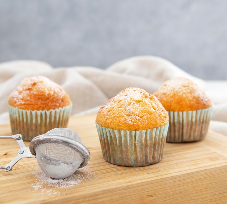 В силиконовые или металлические формы для выпечки поместите бумажные формы для кексов и наполните каждую из них по 2 столовые ложки теста, не доходя до края. Предварительно разогрейте духовку до 180 градусов и выпекайте кексы в течение примерно 20-25 минут.