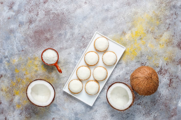 Всыпьте кокосовую муку и стружку, тщательно перемешайте, чтобы не осталось комков.