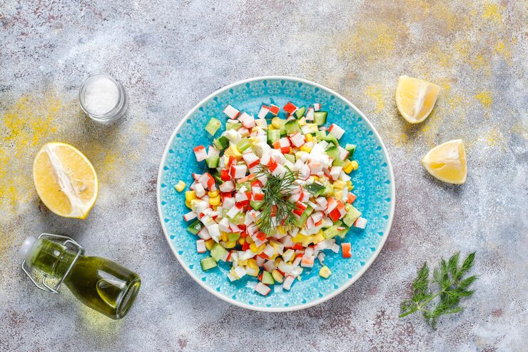 Для ежедневного рациона предлагаю простой салат с крабовыми палочками, огурцом и кукурузой. Этот легкий и хрустящий салат может понравиться широкой аудитории.