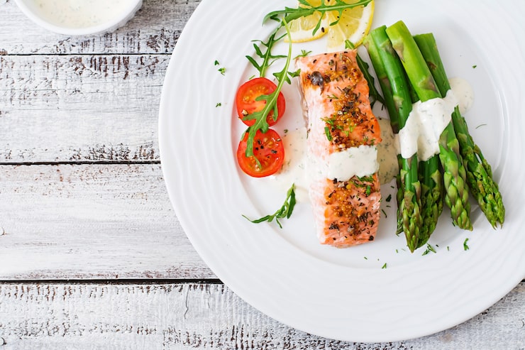 Переложите куриные грудки со спаржей на тарелку и сервируйте с соусом «Голландез».