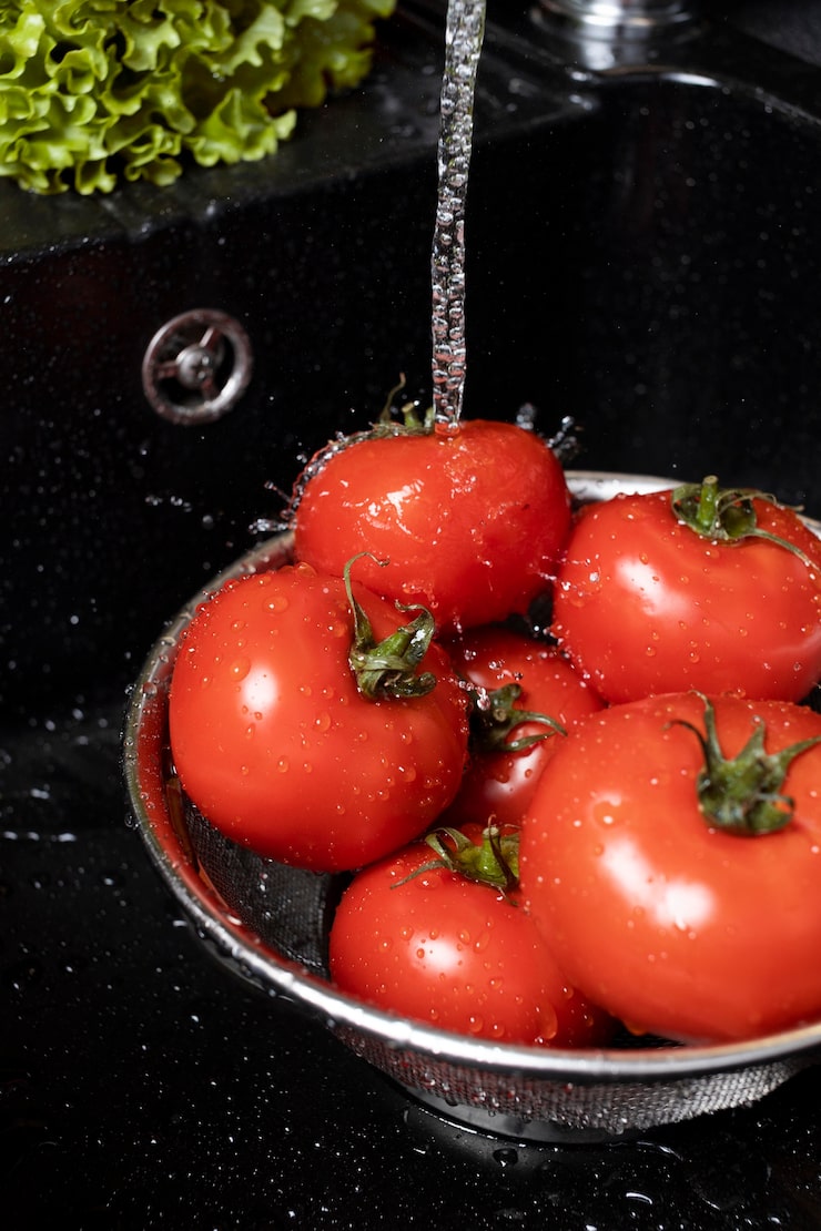 Необходимо подготовить все компоненты. Помойте спелый помидор вместе с зеленью, затем обсушите их.