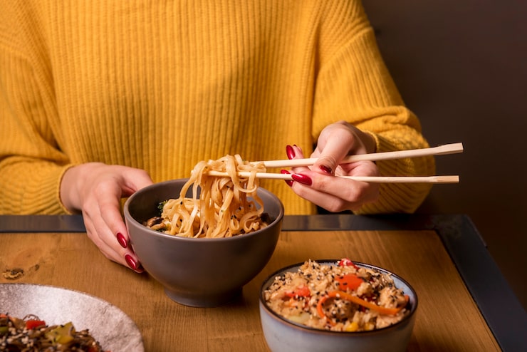 Готовый лагман удобно подавать в порционных плошках: сначала выкладывается лапша, затем она заливается ароматным супом с мясом и овощами.
