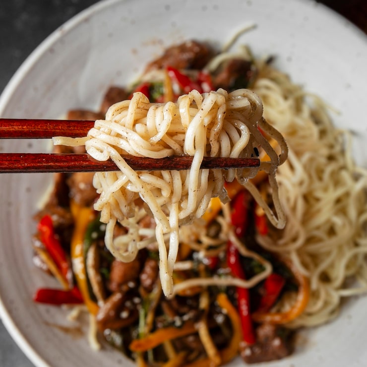 Пока мясо готовится, отварите лапшу или спагетти в кипящей воде. Время варки составит 7-10 минут, до достижения мягкости. После этого откиньте макаронные изделия на дуршлаг и промойте их холодной водой.
