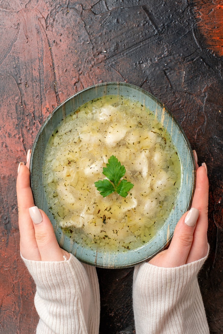перед подачей мадридский чесночный суп посыпают измельченной зеленью.