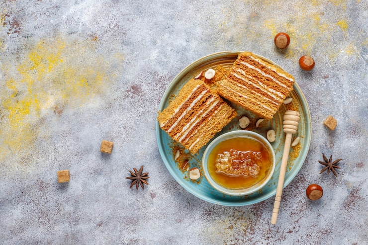 Даже при отсутствии цветочного меда можно создать красочный и яркий медовик. В качестве его заменителя вполне подойдет карамель, приготовленная из сахарного сиропа, сметаны или сливок и сливочного масла.