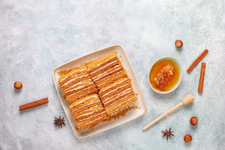 Яркий медовик – отличный повод пригласить всех членов семьи на вечерний чай. Приготовить этот торт довольно легко, и в процесс можно вовлечь даже детей. Крем хорошо сохраняет форму и делает коржи сочными.