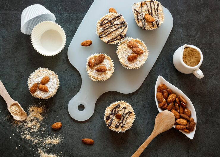 Для выпекания миндальных капкейков подготовьте все требуемые ингредиенты. Чтобы продукты не были слишком холодными, а сливочное масло приобрело мягкую консистенцию, извлеките их из холодильника заранее.