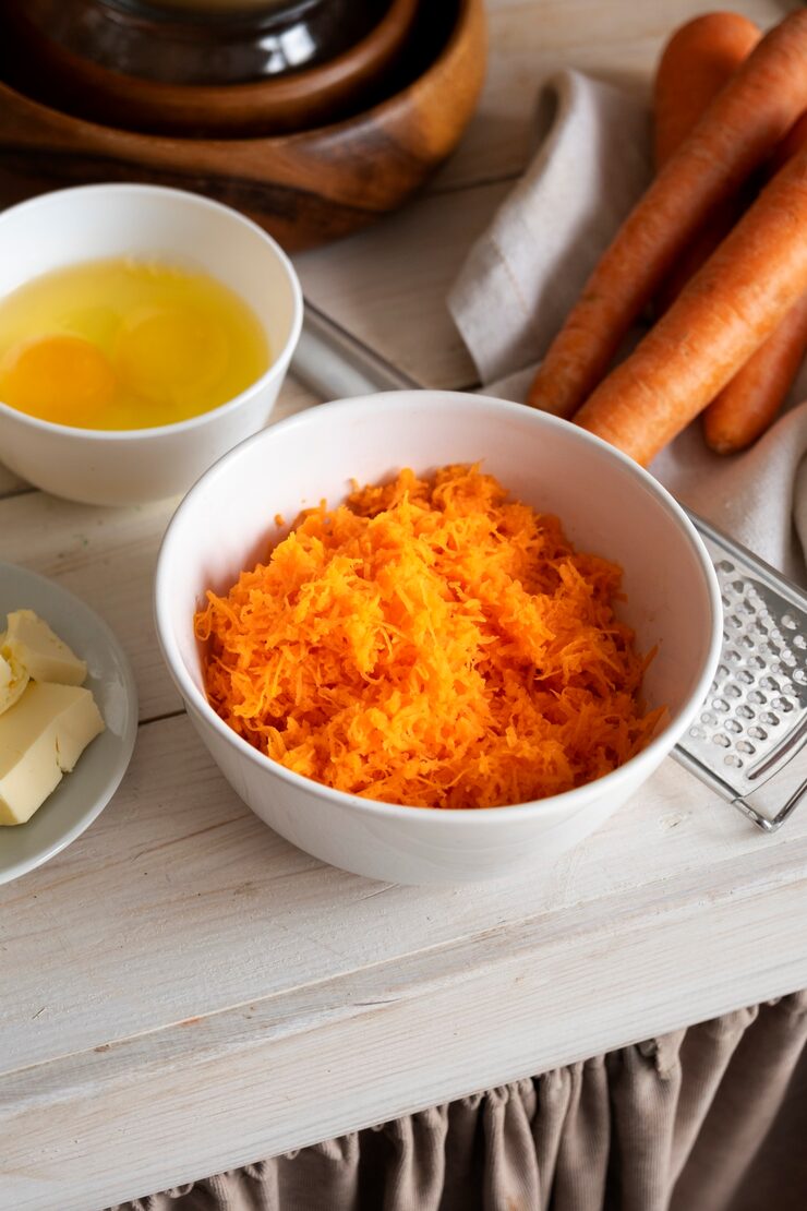 В готовую массу добавляют остальные компоненты: соль, разрыхлитель, растительное масло, просеянную муку и натертую морковь.
