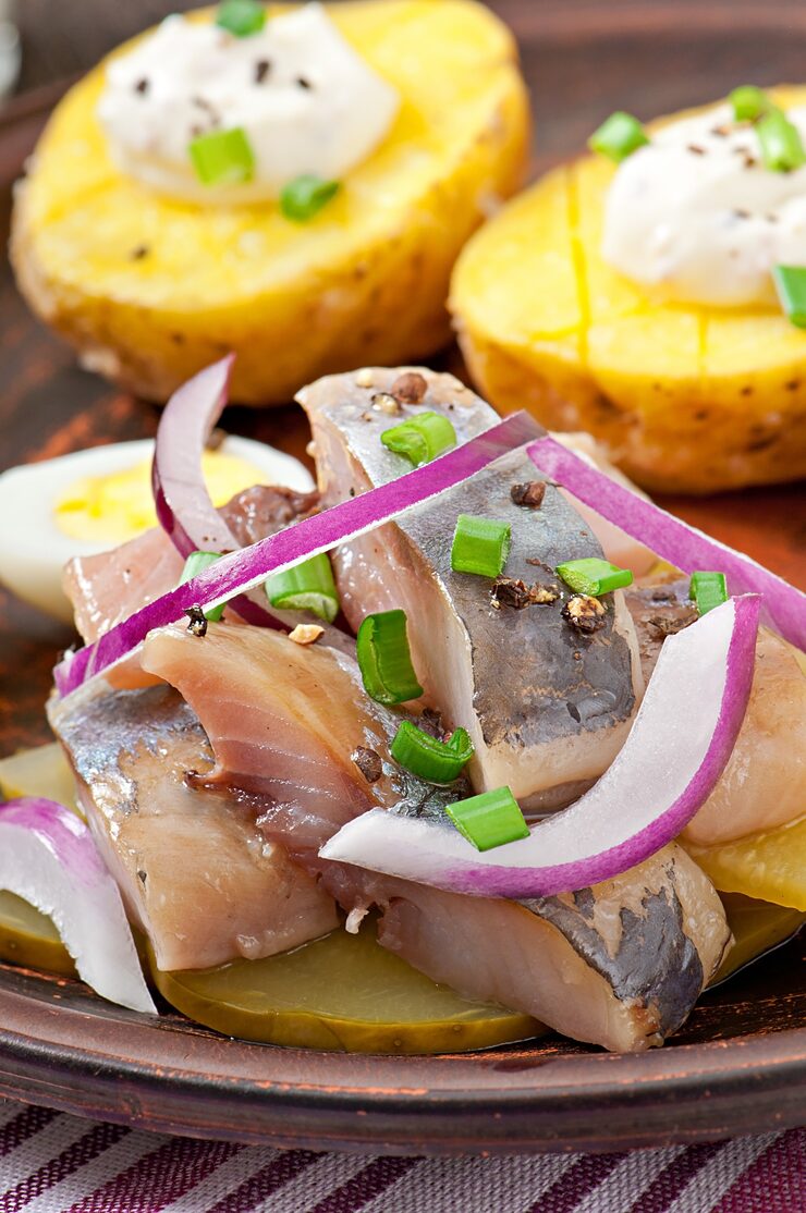 Слабосоленая сельдь прекрасно сочетается с яблоком, картофелем, солеными огурцами и красным луком. Это позволит создать вкусный и питательный немецкий салат. Он обладает выраженным ароматом и острым вкусом. Наибольшее время уходит на варку картофеля. Если вы приобрели очищенное филе сельди, то также сэкономите время.