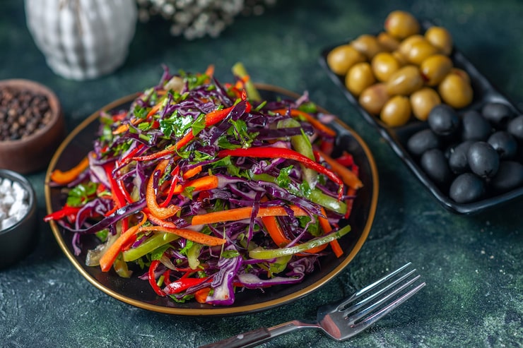 Одесский салат, приготовленный с сельдереем и баклажанами, готов к подаче. Насладитесь вкусом!