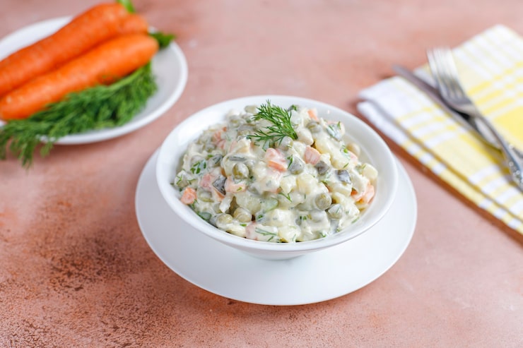Добавьте в салат свежую зелень, нарезанные овощи или ягоды. В качестве дополнений у меня морковь, горошек, оливки, кусочки сыра и тертый яичный белок. Салат оливье с тунцом уже подготовлен. Его можно подавать немедленно, однако, на мой взгляд, более насыщенным вкусом он станет, если дать ему настояться пару часов. Готово!