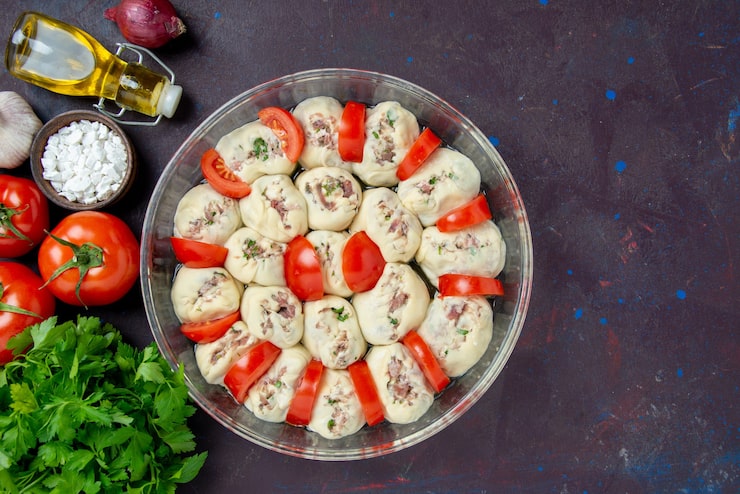 Из подготовленного теста следует сформировать шарики одинакового размера. У меня получилось восемь штук, каждый весом 100 грамм. Их необходимо расположить в смазанной маслом форме, соблюдая определенное расстояние между ними.