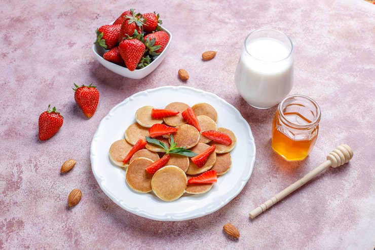 Выпекайте все панкейки и переложите их на тарелку. Подавайте к столу горячими и приготовьте ароматный чай.