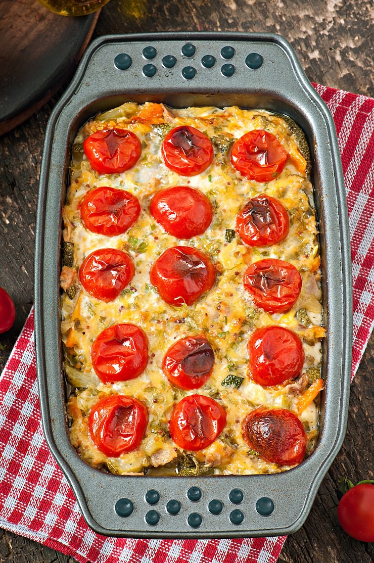Нарезанные помидоры выложите поверх сыра. Края теста заверните сверху. По пирогу распределите кружочки лука. Смажьте верх оливковым маслом. Это позволит овощам не пересыхать при выпечке.