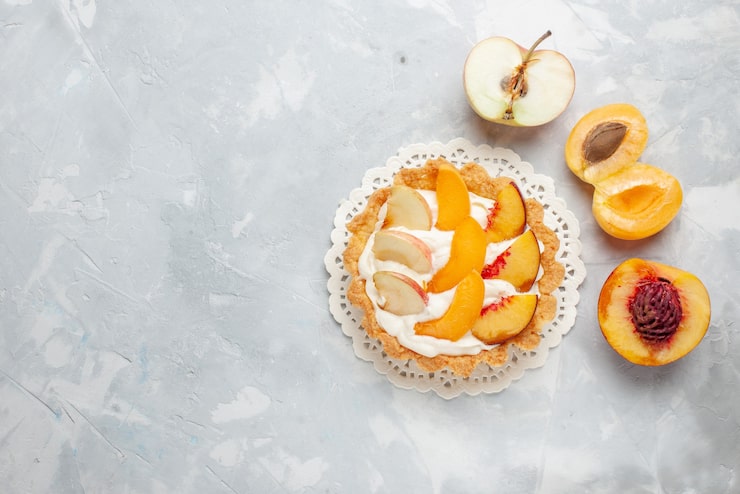 Обрежьте верхнюю часть пирога и украсьте его персиками и клубникой. Подавайте к столу.