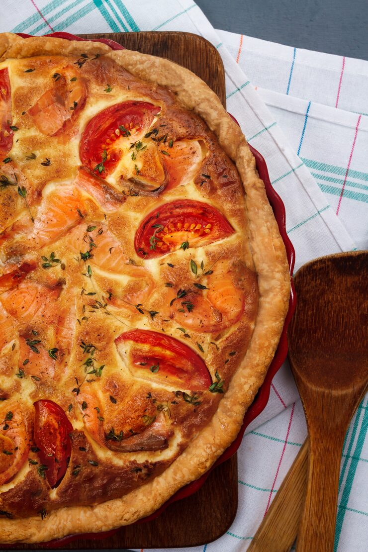 - Форму для запекания смазывают маслом. Тесто извлекают из холодильника, раскатывают в круг и помещают в форму для запекания, формируя бортик. Отваренные овощи выкладывают на тесто, аккуратно распределяют по его поверхности и добавляют кусочки консервированного тунца. Духовку разогревают до 175 градусов. Яйца смешивают с молоком и взбивают. Добавляют протертый сыр. Полученной смесью заливают начинку пирога. Пирог помещают в духовку и выпекают в течение 45 минут.