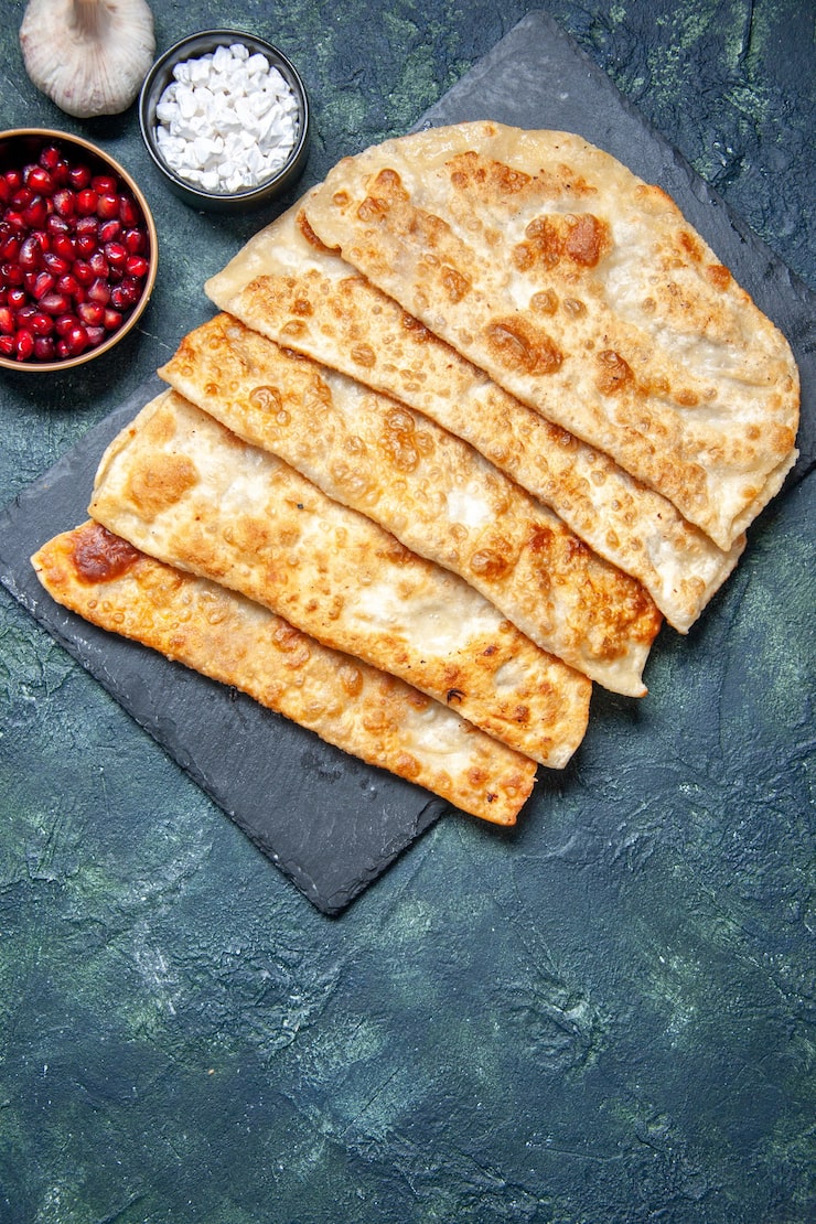 Лаваш следует нарезать на полоски размером 9 на 28 см. Отношение ширины к длине полосы должно быть не менее 1:3, так как для формирования закрытого треугольника с обеих сторон требуется не менее четырех заворотов.