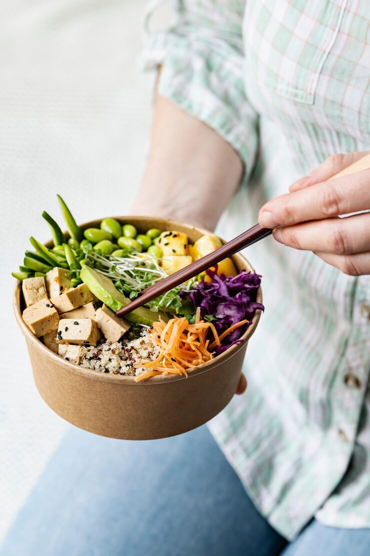 В глубокую миску выложите рис, а поверх него – овощи и тофу.