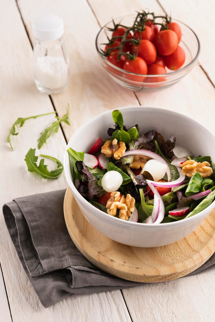 Зелень промойте и измельчите, затем добавьте в салат. Посолите и поперчите блюдо по вкусу. Влейте оставшееся растительное масло и аккуратно перемешайте.