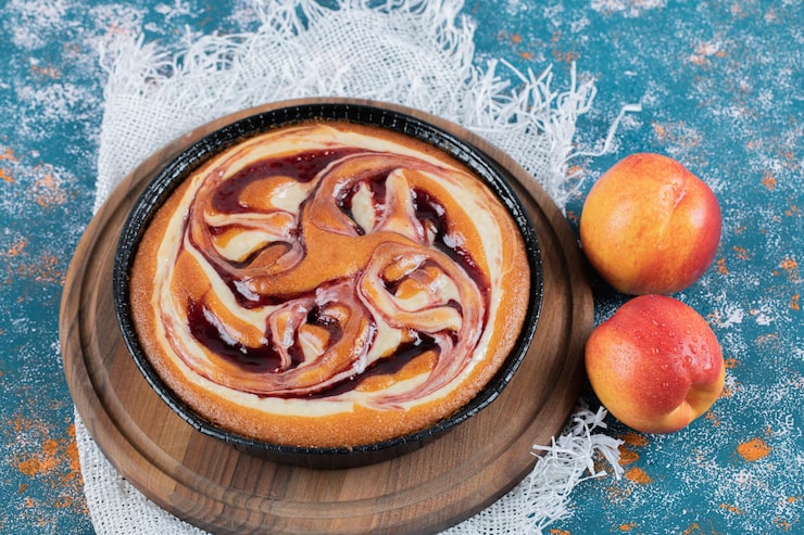 Запеканка обладает насыщенным вкусом, а персики отлично дополняют ее, делая более сочной. Готовое блюдо можно украсить кусочками персиков или подавать со сметаной или финиковым сиропом. Вместо персиков допустимо использовать абрикосы или другие фрукты.