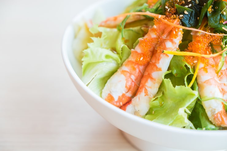 Затем поливаем салат соусом и добавляем сверху приготовленные креветки. Салат готов!