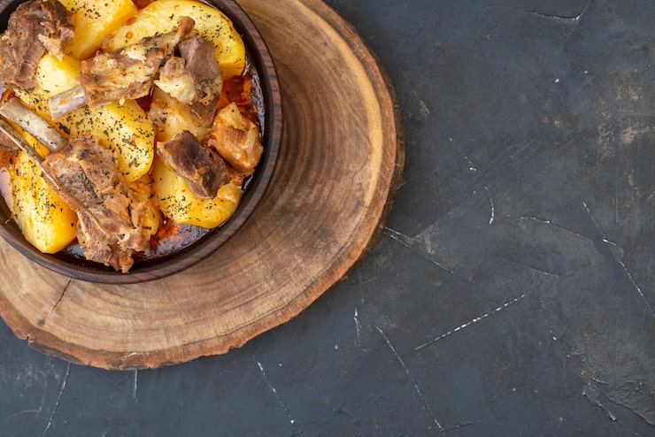 В свиные ребрышки, предназначенные для приготовления, добавляют морковь и картофель, а также небольшое количество бульона или воды. Блюдо готовят 5-7 минут, после чего добавляют кабачки. Лук, нарезанный полукольцами, добавляют за 5-7 минут до окончания приготовления. За 5-7 минут до готовности добавляют помидоры, нарезанные дольками, и добавляют специи, соль.