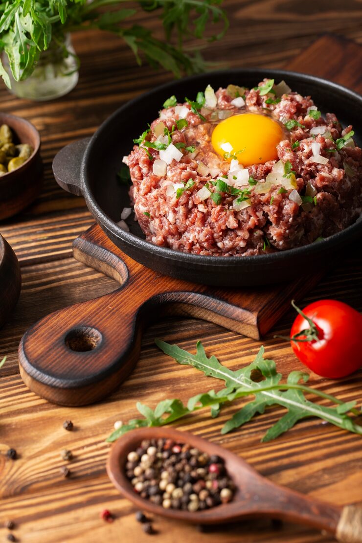 В миску поместите мясной фарш, добавьте специи, зелень, разбейте яйцо и посолите.