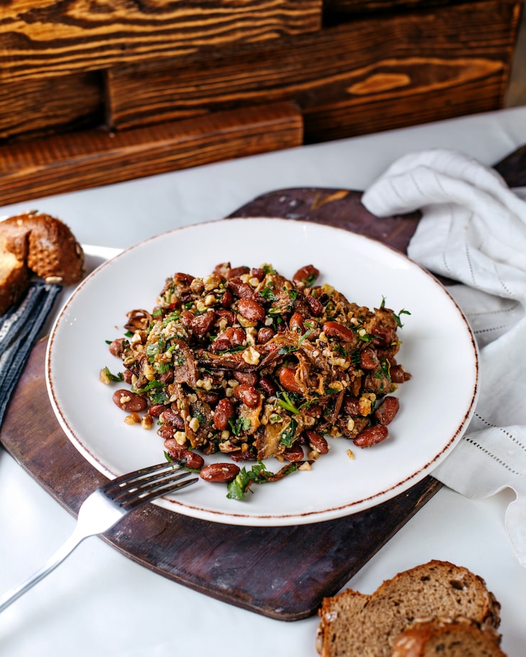 Ароматный салат с говядиной и фасолью уже готов. Подаем салат на свежий зеленый лист. Приятного аппетита!