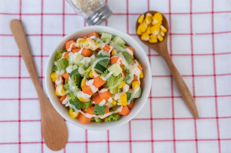 Заправьте салат нежирным майонезом, посолите и поперчите по вкусу.
