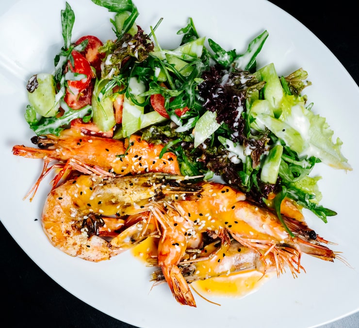 Обжарьте креветки в оливковом масле в течение одной минуты, затем добавьте их в салат.