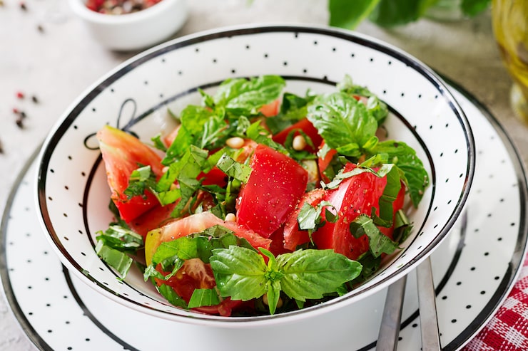 При отсутствии сыра фета салат приобретает исключительно летний характер, однако добавление сыра мгновенно трансформирует его во вкусный, необычный и подходящий для любого времени года. В этом салате каждый компонент играет важную роль: базилик гармонично сочетается с помидором, подчеркивая и обогащая его вкус, а чеснок придает блюду завершенность. Вместо феты можно использовать брынзу, что сделает салат немного более соленым и весьма пикантным.