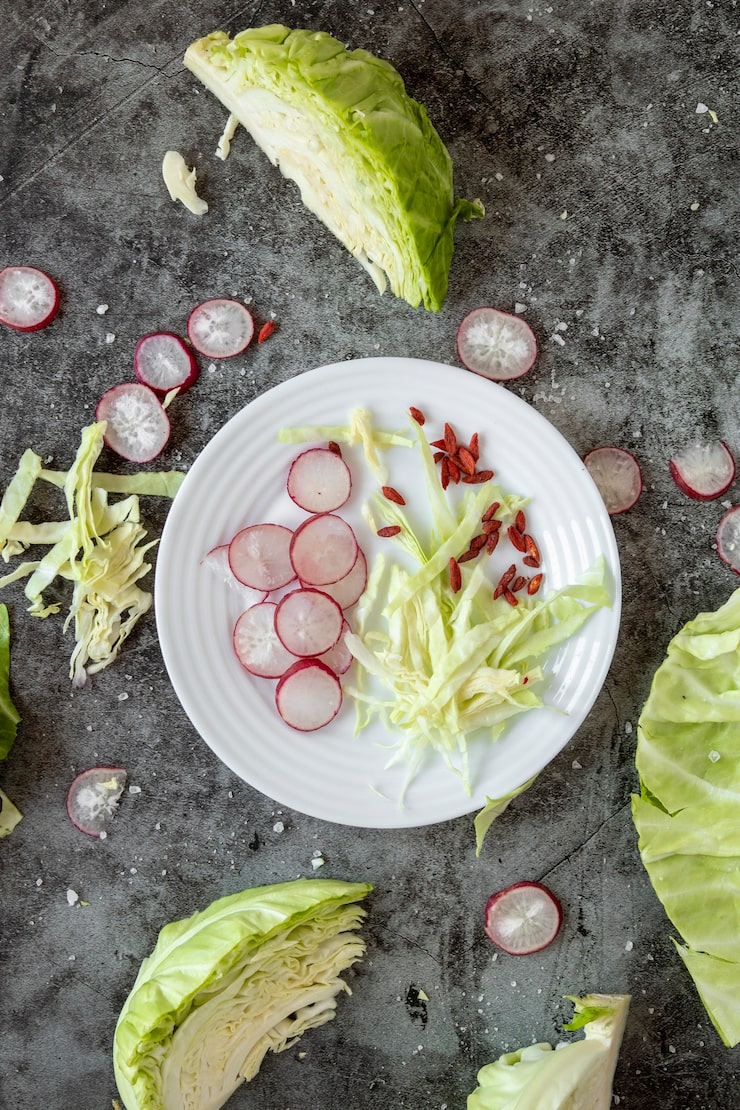 Салат из зеленой редьки приготовлен и готов к подаче.