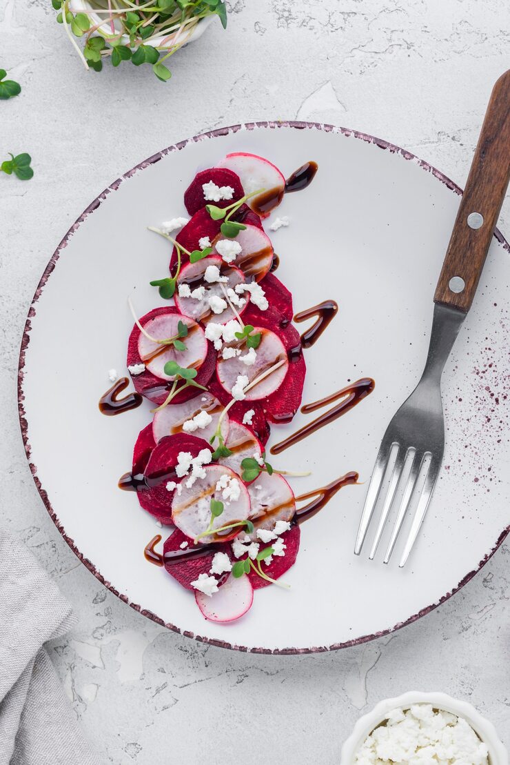 Приправьте блюдо солью и перцем, добавьте немного оливкового масла и украсьте свежей зеленью. Подавайте к столу сразу после приготовления, чтобы свекла не успела изменить цвет сыра.