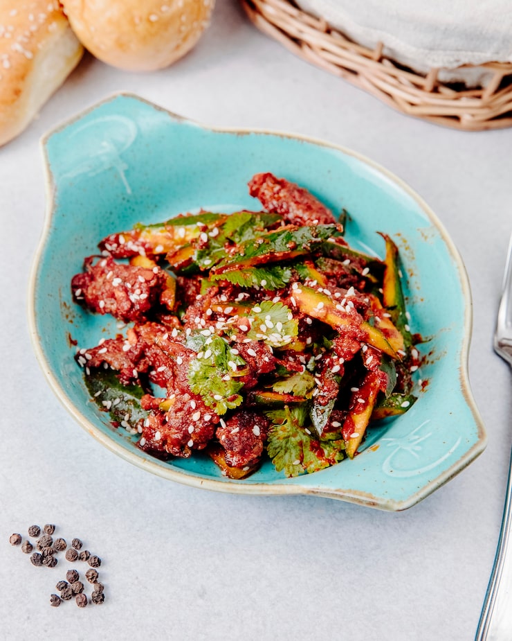 Салат со свиным сердцем и огурцами готов к подаче. Его можно предложить в качестве закуски.