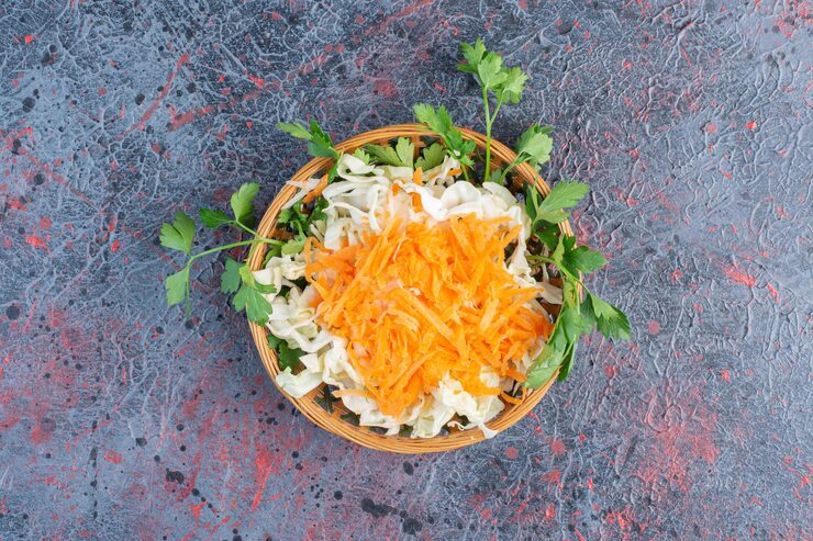 Овощи нарезаем тонкой соломкой, затем маринуем в смеси специй, масла и уксуса. Полученный салат отличается сочностью, хрустящей текстурой, насыщенным вкусом и привлекательным внешним видом. При более длительном настаивании овощи лучше пропитаются маринадом.