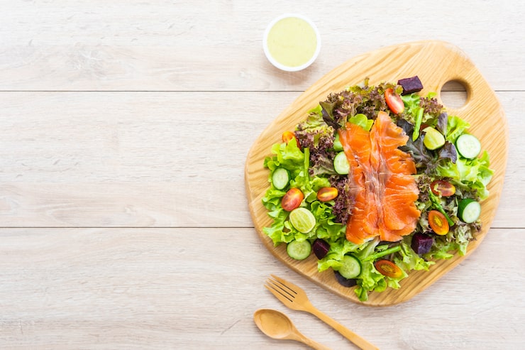 Нарежьте семгу тонкими ломтиками и распределите их поверх салата. Салат рекомендуется подавать к столу сразу после того, как он будет приготовлен.