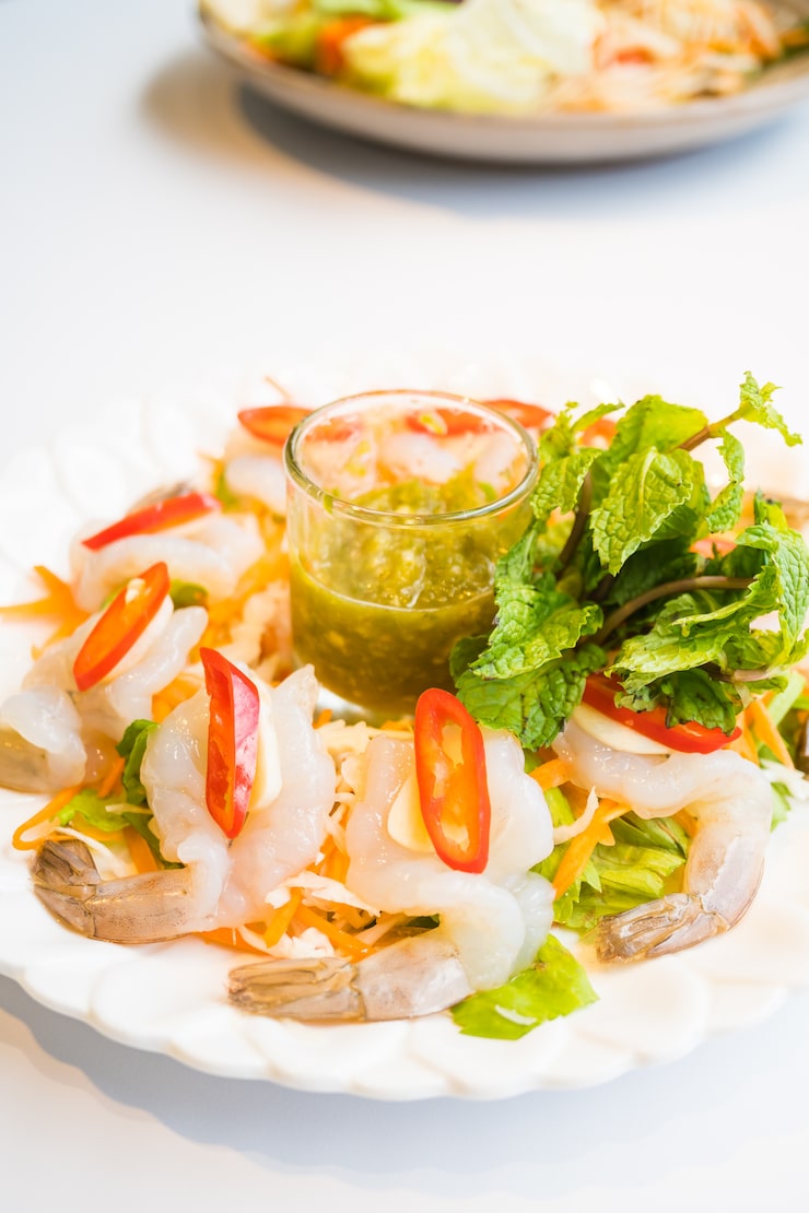 Разложите отварные креветки поверх салата и полейте соевым соусом и маслом. Добавьте перец и соль по вкусу.
