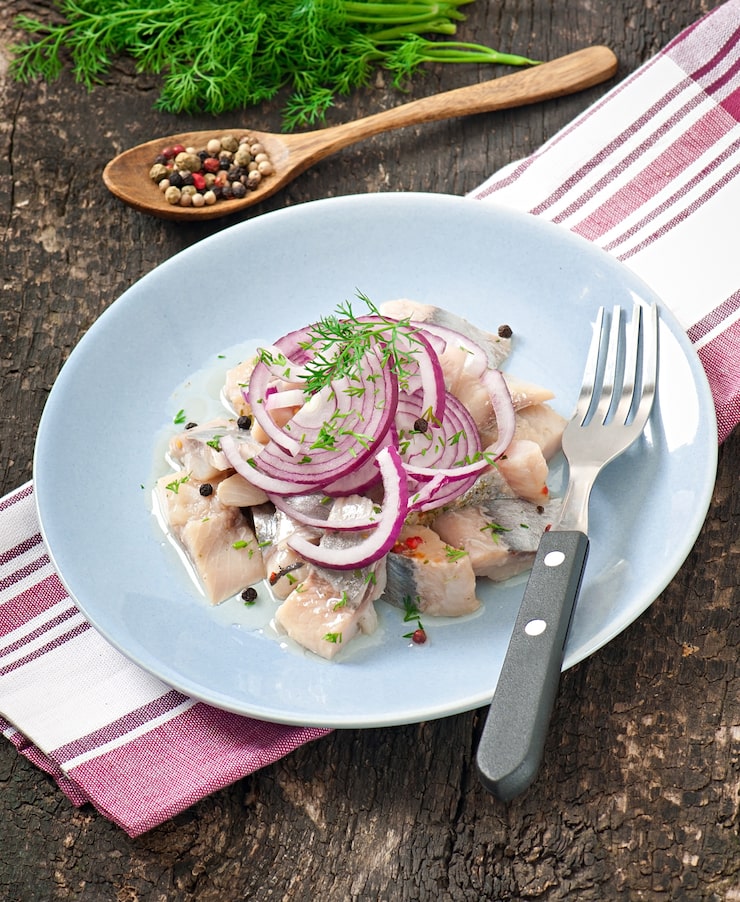 Селедка в салате традиционно сочетается с картофелем. Если заменить его белой фасолью, салат приобретет совершенно иное вкусовое решение!