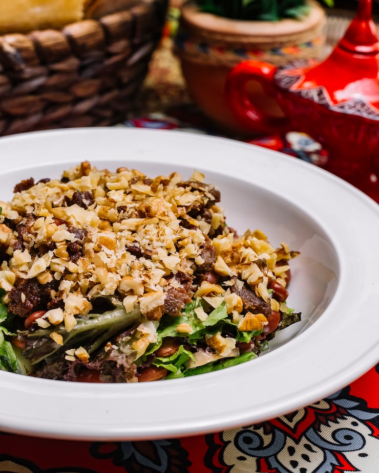 Этот салат с говядиной и грецкими орехами обладает прекрасным вкусом и насыщает. Его приготовление не займет много времени, а привлекательный внешний вид стимулирует аппетит. Рекомендуем попробовать!