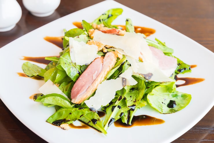 Насыпаем в салат порезанный шпинат.
